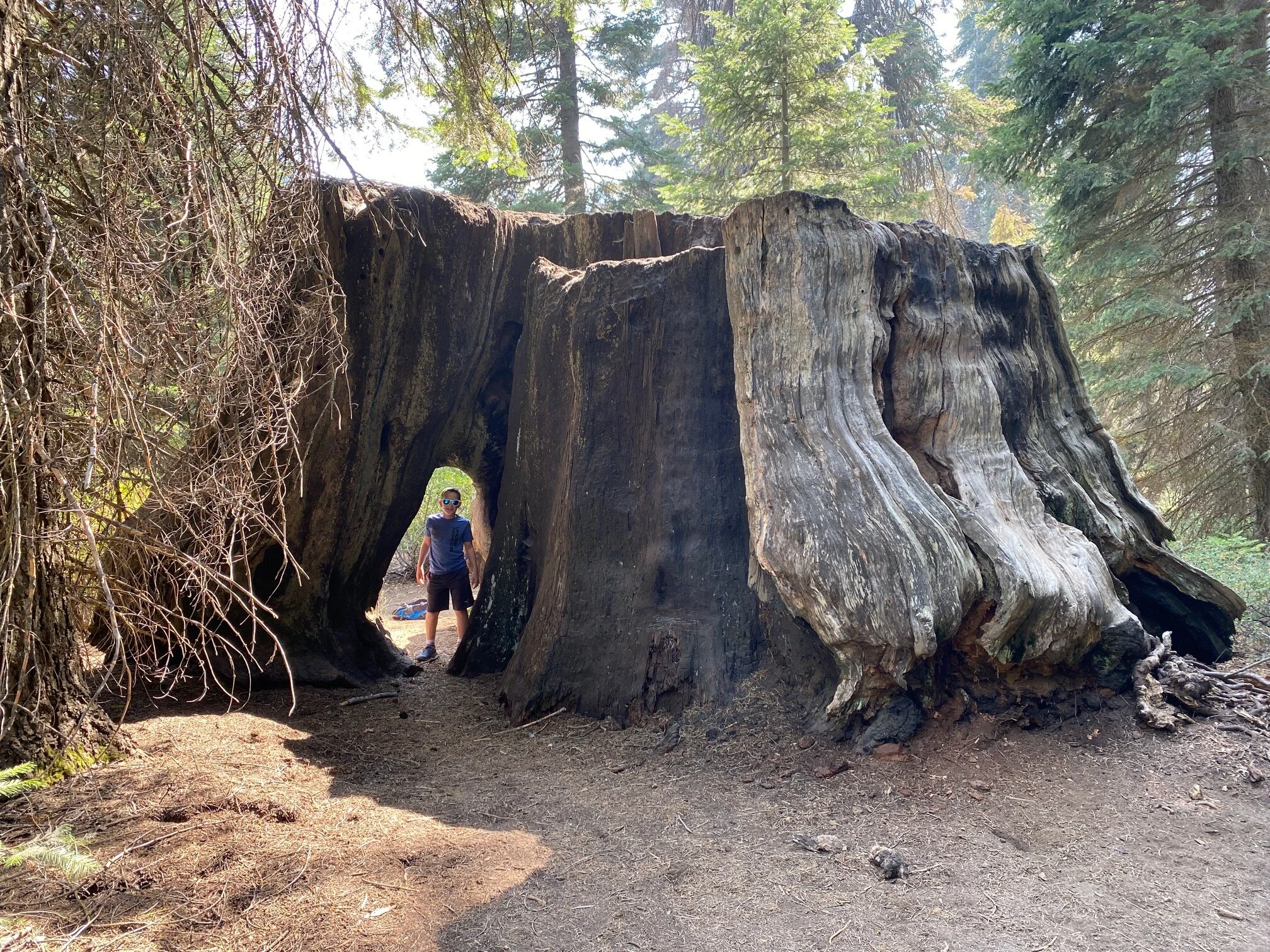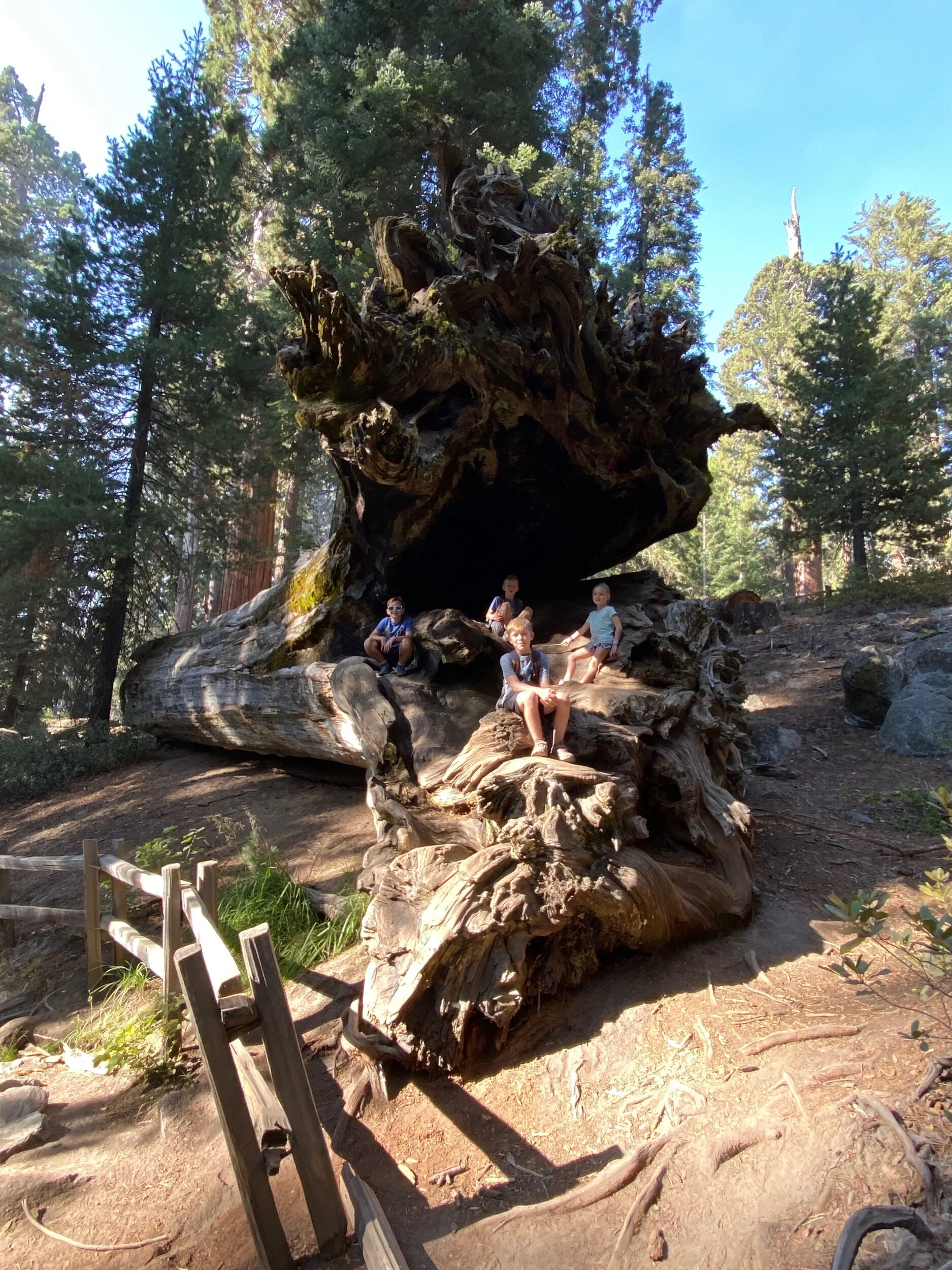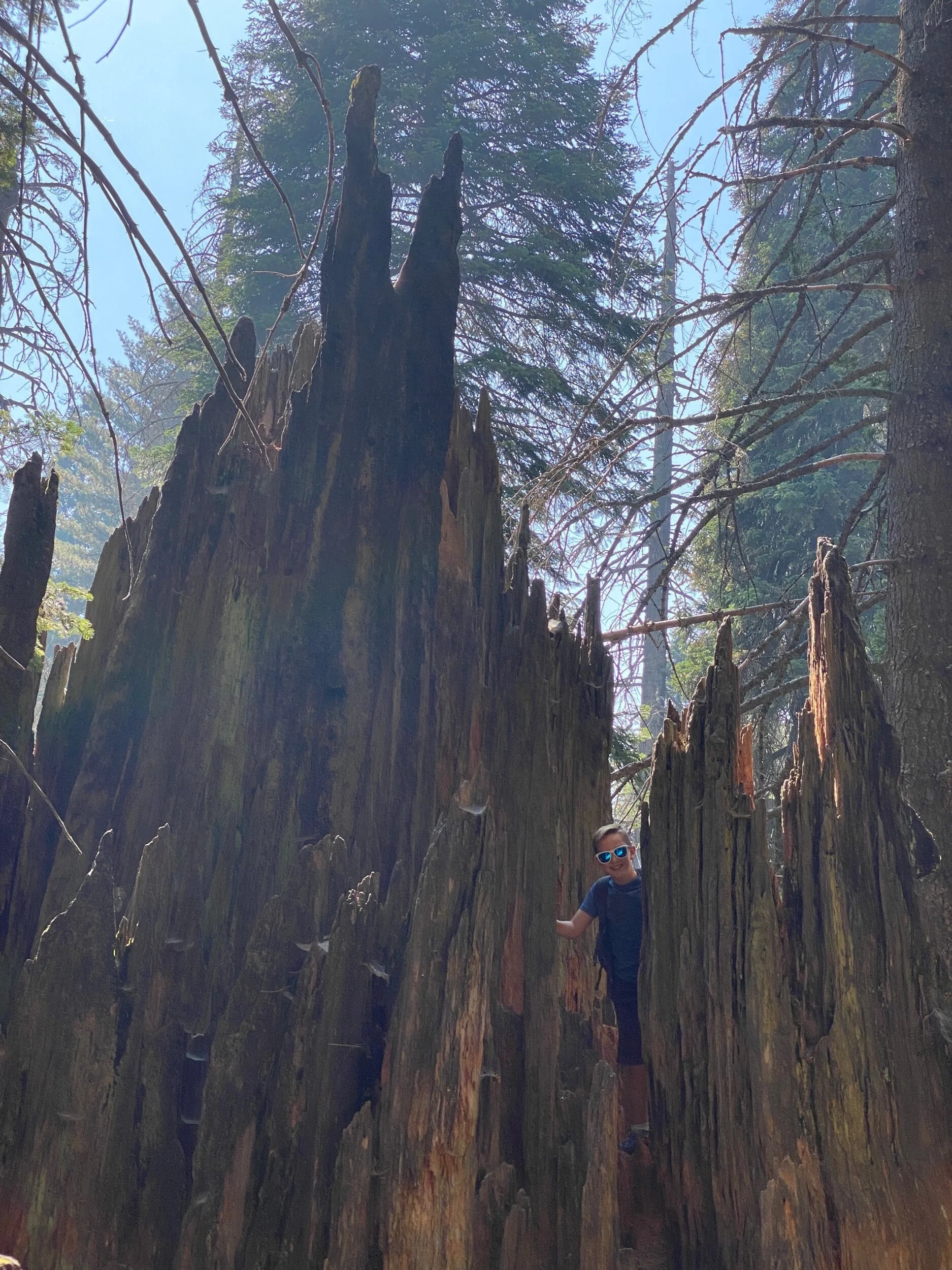 Sadly Sequoia National Park was closed because of fires but Kings Canyon National Park was open. As usual, it was all to ourselves. After setting up camp, we started our first hike. I was blown away by the size of those trees. It just blows my mind that someone thought “Hey, we should cut this tree down and turn it into shingles”! It just makes me angry. They were awesome to climb on though. Look at the picture where we all laid down.