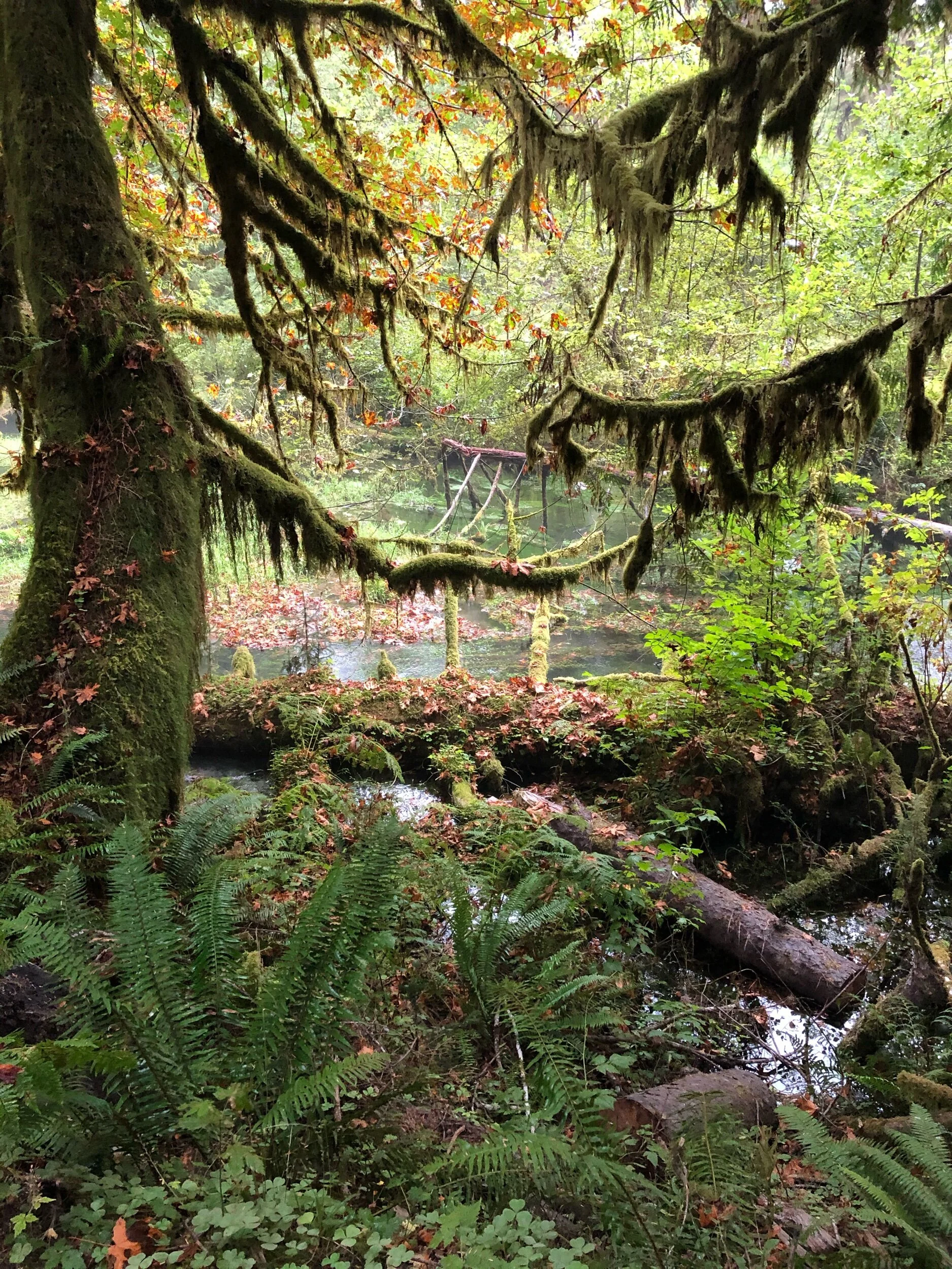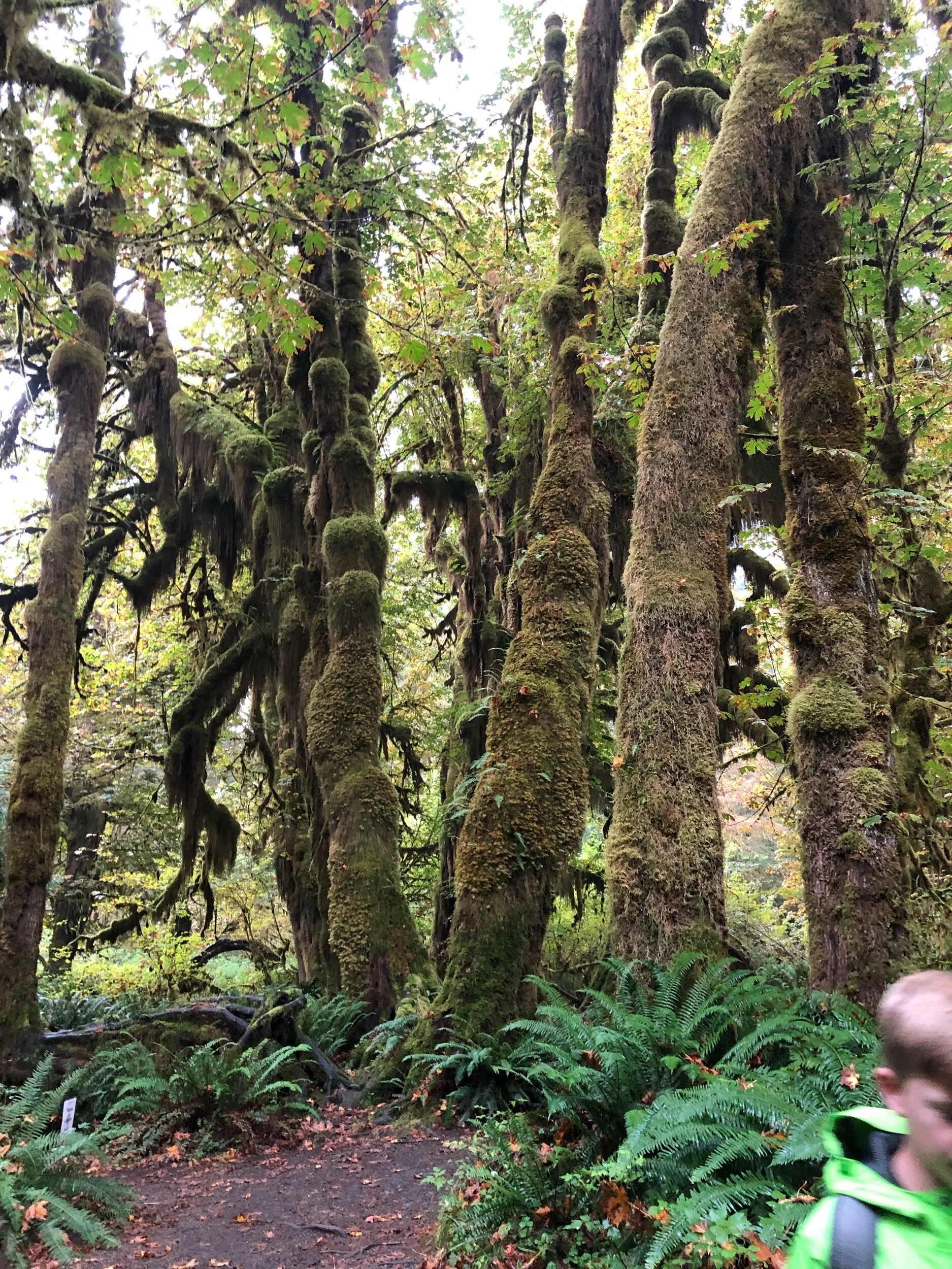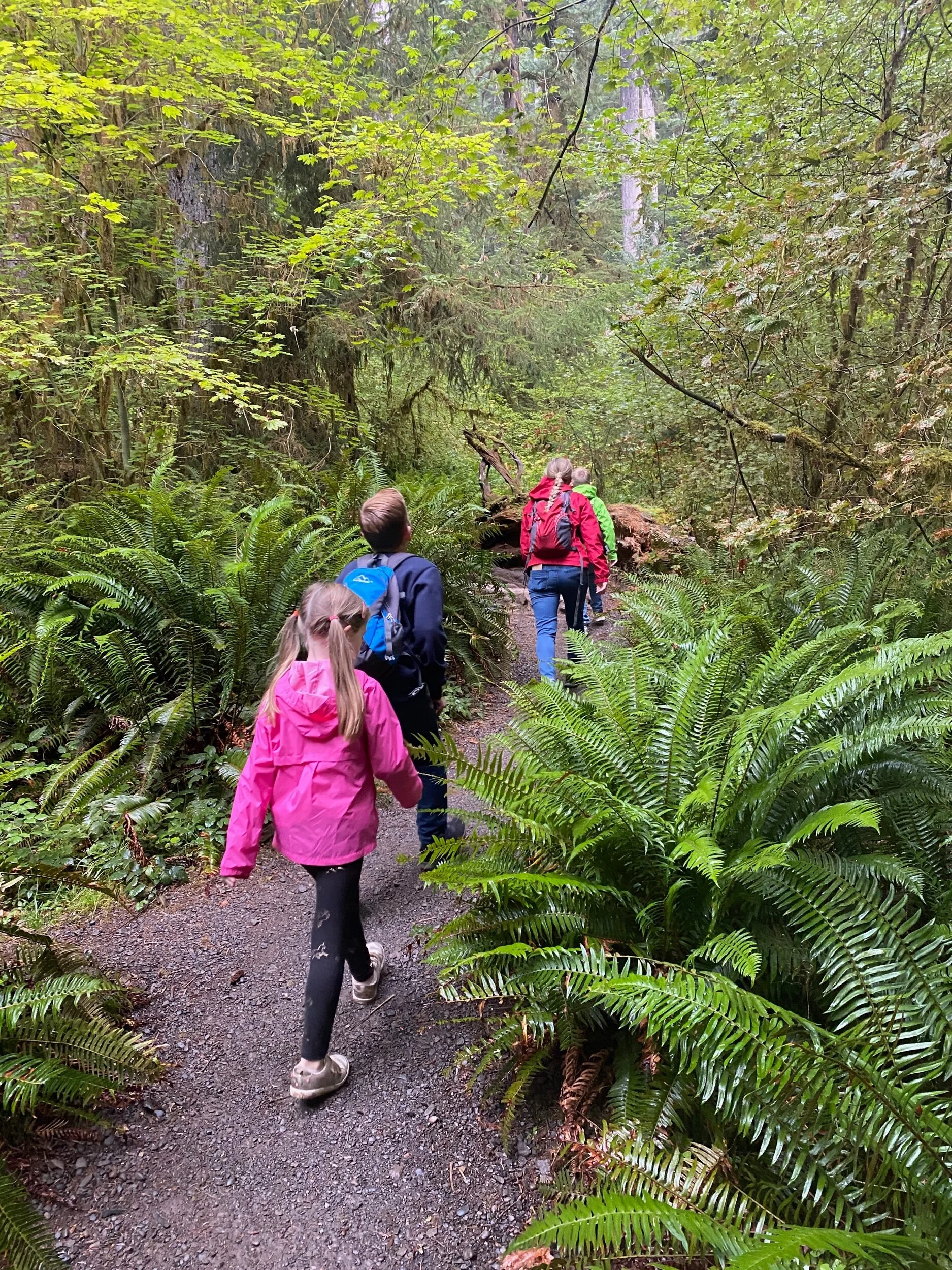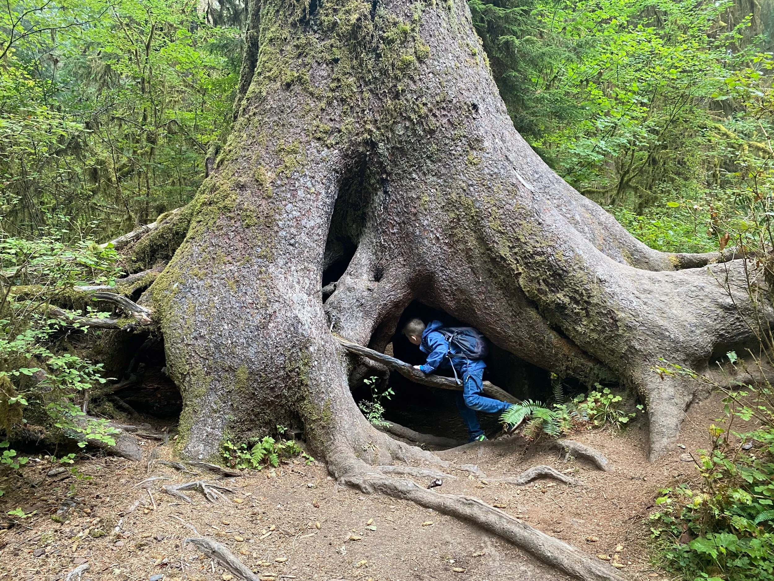Today we visited the rainforest of Washington. We drove about 45 minutes and made it to our hikes. The drive was very unlike the other part of Olympic. The treees were so tall and mossy. The first hike was along this mountain stream. A lot of the trees had exposed roots and in some we could all fit.